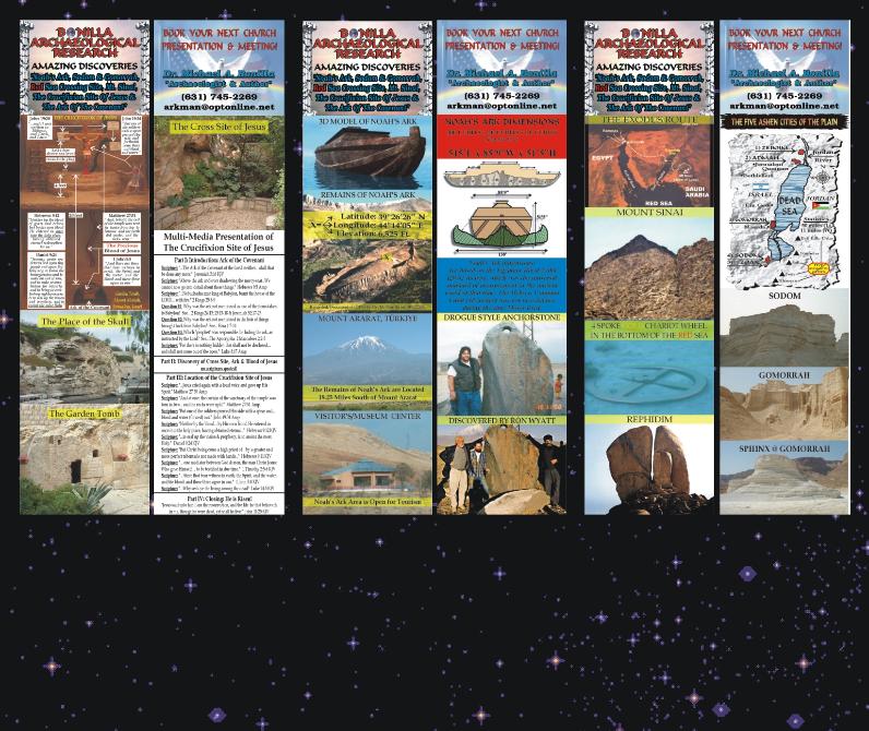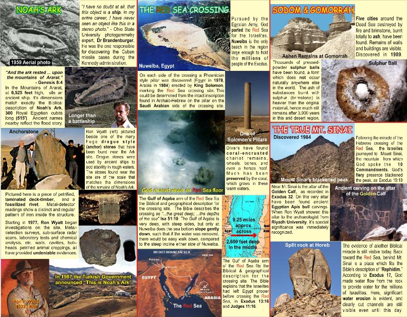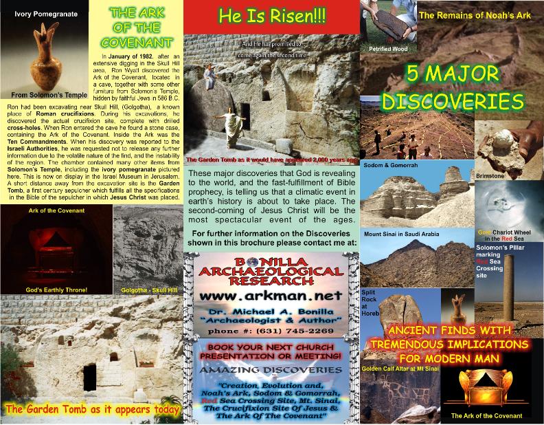 | THE 5 MAJOR DISCOVERIES "MINI POSTERS: They are only $1.00 each, but a minimum order of 10 will be required. Shipping and handling is included with all orders. These "Mini Posters" have great color pictures and are very informative in regards of the documentation provided per each discovery. These Mini Posters make awesome witnessing tools!!! |
