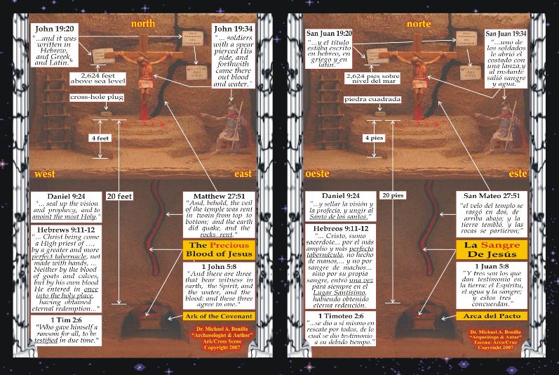 | THE CRUCIFIXION SITE SCENE OF JESUS: These 8½" by 11" posters were designed & created by the author in both English and in Spanish versions. This is an actual photo from the display that I have in my office. This photo comes with the corresponding scriptures in English and or Español, and both pertaining to certain special details. This photo also represents the most accurate rendition and representation of the Cross Site Scene of Jesus in the world. These awesome posters were created to show the world, of this powerful truth and historical event. Either one of these posters will fit perfectly on any (8½" by 11") size frames. Also, you may combine in any way, whichever posters in English and or Spanish versions you may desire! $10.00 for 3 posters in any combination (is also the minimum order). These 8½" by 11" Posters make awesome witnessing tools!!! |