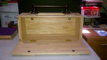 | The purpose of this project was to create a custom-made transportation/carrying case for my Indiana Jones theme style and version of the Ark of the Covenant 1/6 scale model. I also have another Indiana Jones theme style of the Ark of the Covenant 1/4 scale model which is much bigger and certainly heavier (see Project #1). The smaller version of the Ark of the Covenant would be much easier to carry around! Well it started over a month ago, I gave my brother-in-law Nat the dimensions that I needed for my 1/6 scale model of the ark. Nat, being a wood craftsman and handyman (something, I simply am not...lol), designed a beautiful wooden box that opens from the front of the box using approx. 10 lbs of force due to the magnetic buttons (2) inside the box which insures that the lid remains close until using the 10 lbs. of force to open it. |