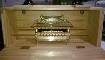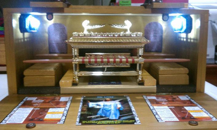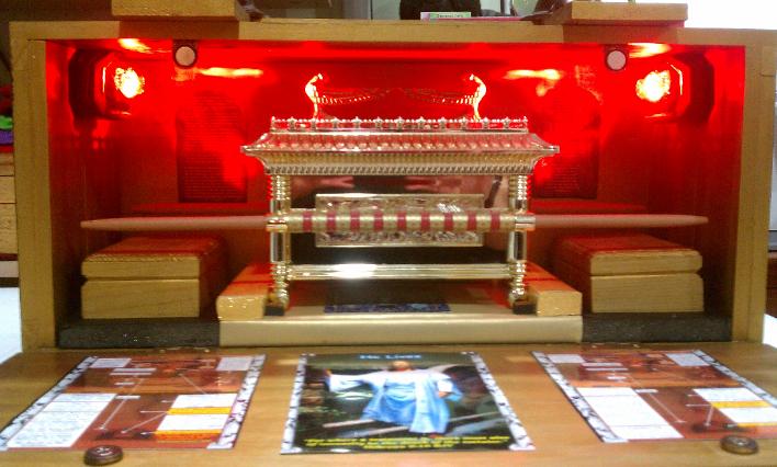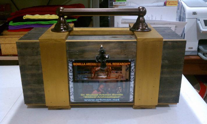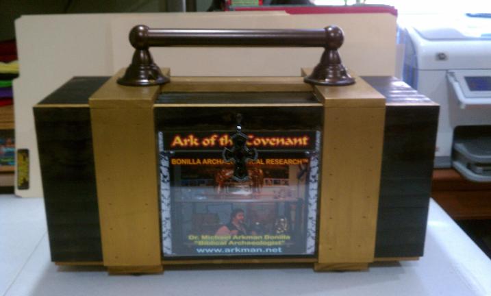 | I painted the inside of the carrying case with metallic gold paint and I painted the outside of the box with Ebony stain and sealer and also painted the thin wooden strips with same metallic gold paint and I glued a 5" by 7" photo display casing with one of my ministries card. The inside of the box has a ½" black rubber base, with gold paper and gold sparkling stick paper underneath the bottom of ark. I also have a photo of a graphic representing the High Priest's Breastplate. In the rear of the box, I also have a nice graphic/photo of the 10 Commandments. Underneath the poles, I have to wooden gold boxes where I can place my ministry cards inside. Above on top of the sides of the box, I have 2 battery powered lights that can turn either red or neon white. Finally, I glued (3) photos pertaining to the Cross Site Scene of Jesus and the Ark of the Covenant (both English & Spanish) and also the nicest and most awesome photo (representation) of Jesus resurrecting. The last thing I installed was the metallic gun metal color cross with (6) onyx stones (to be used as a door knob). Also, the ark's dimensions are: poles: 15" long, ark is 6" high, by 7½" wide by 5" deep and the custom box's dimensions are: 17½" long by 7¾" deep by 11½" high. But wait... on Thursday June 16th, I decided to add and laminate on both (front & rear) of the carrying box... the words Ark of the Covenant. I also touched up, both the ebony stain and sealer paint color and the metallic gold paint color. It's not easy when you are using (2) different kinds of paints on one box. Both paint different... it was a challenge! Below is the final and finished product... this project has been completed! |
