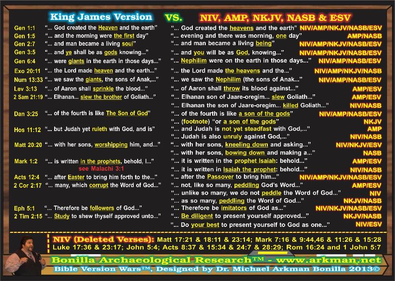 | The above, 5" x 7" postcard was designed, to show the differences between the King James Bible vs the NIV, NKJV, AMP, NASB and ESV...were incredible and very subtle. Most Christians believe that the reason we have so many bible versions is so that people could understand better the word of God. Problem is, we don't need man's opinion to understand God's word, but rather we require the help that comes from the Holy Spirit to understand and interpret the holy word of God! I also added a little section on all the scriptures the New International Version (NIV) has purposely deleted and removed... most are written in red ink (words that were spoken by our Lord and Savior Jesus!) Read Luke 24:45 KJV!!! So the enemy is a formidable opponent and extremely crafty. It was his idea to come up with so many bible versions which most are a distortion and perversion of the purity and accuracy of God's holy and spoken word. I'm not saying that using those versions will send you to hell or that God can't move and save someone using "these" versions... what I'm saying is... every Bible teacher and everyone called to the 5 fold ministry should use KJV and most of all, to be aware of the issues with using other Bible versions. The KJV provides the most accurate and purest renditions and representation of God's word, the others are dilutions of His word. Everyone reading this should do their own research. A lot of distortion, dilution and perversion found on the other versions attack and bring doubt and zero in to the majesty & deity of Jesus. |